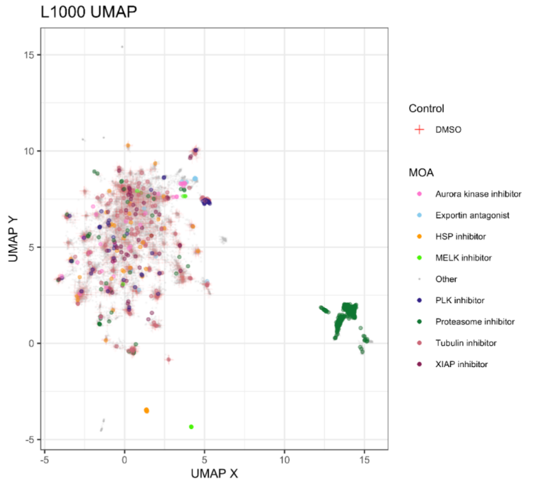 Once upon a time I was replicating the UMAP of the gene expression profiling (L1000) of 1,327 small molecules perturbation from the Drug Repurposing Hub (Way et al. 2022). To my surprise, the first UMAP I generated was seriously odd. I still don’t have a clear explanation of what went wrong but I am sharing my exploration of the issue in case someone comes accross it. A here be dragons tale of computers doing unexpected things which affect analysis.