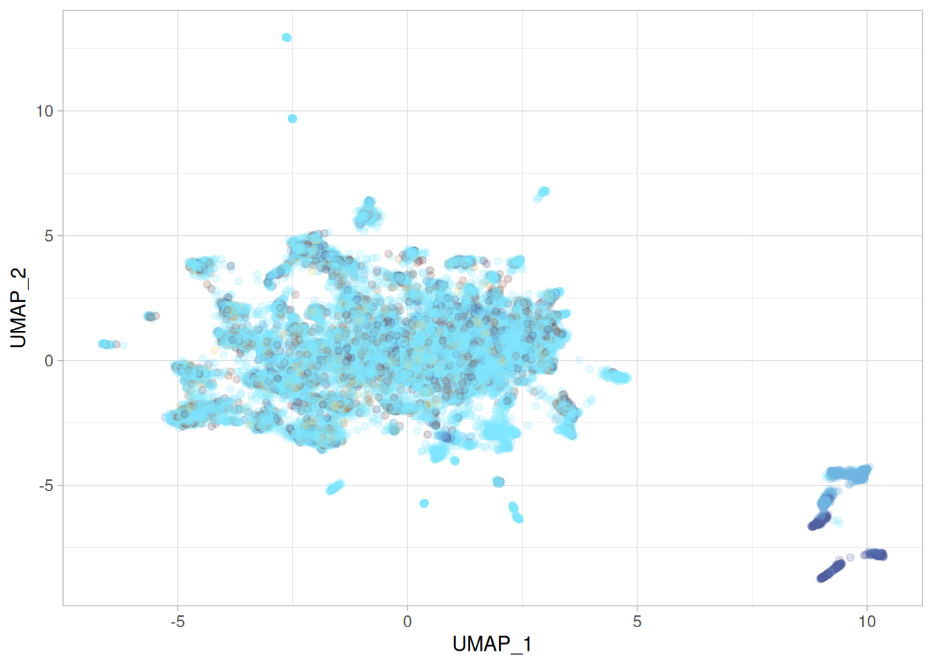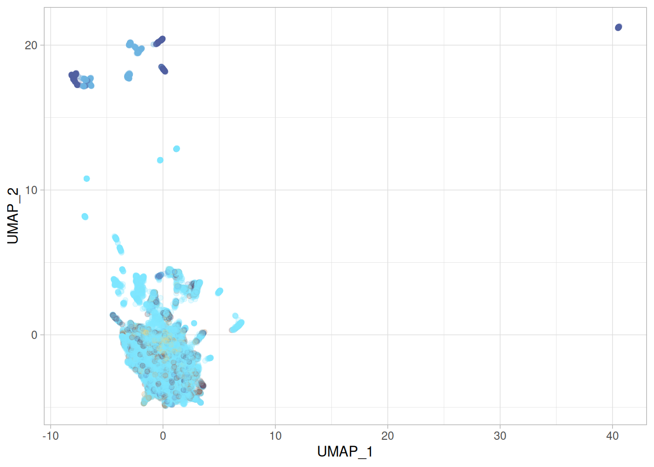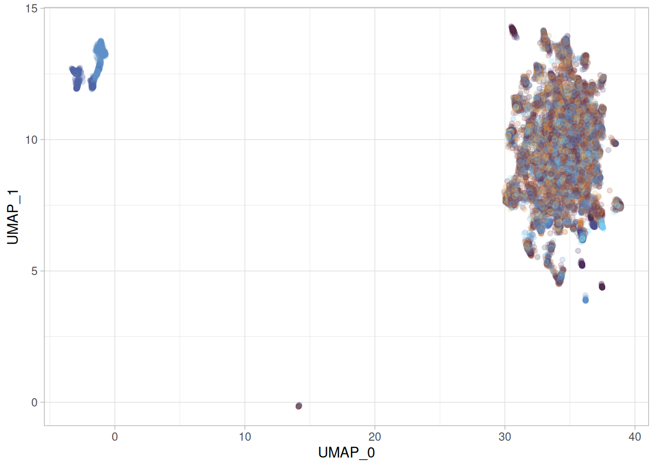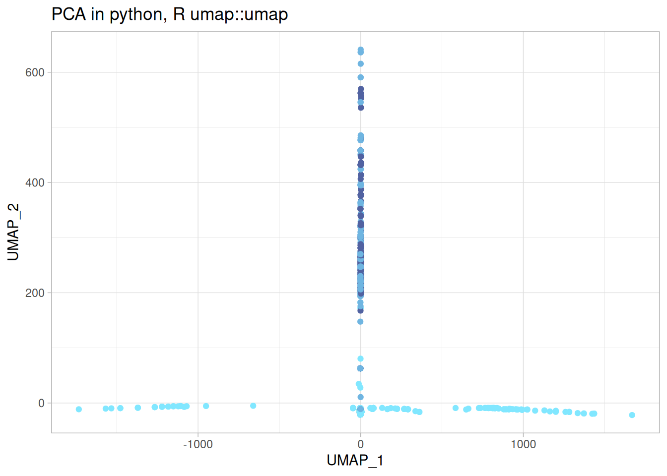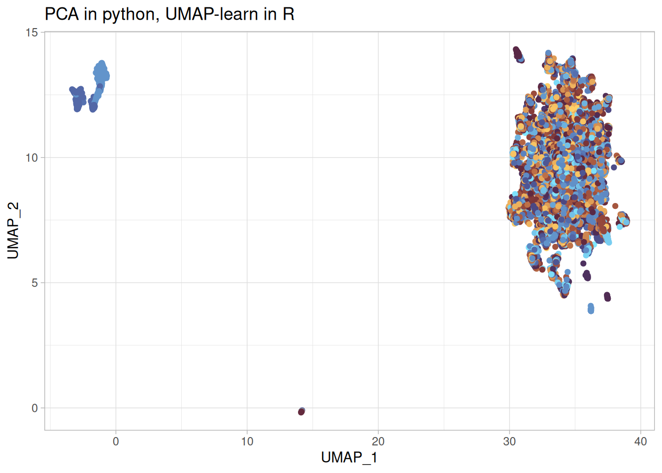 I did make a seemingly harmless change: instead of running umap in python, I took the PCA components and creates the UMAP embeddings in R. This is possible using the reticulate package - because the past, present and future of data science is polyglot. I was basically using this small analysis to POC reticulate and run UMAP in R.